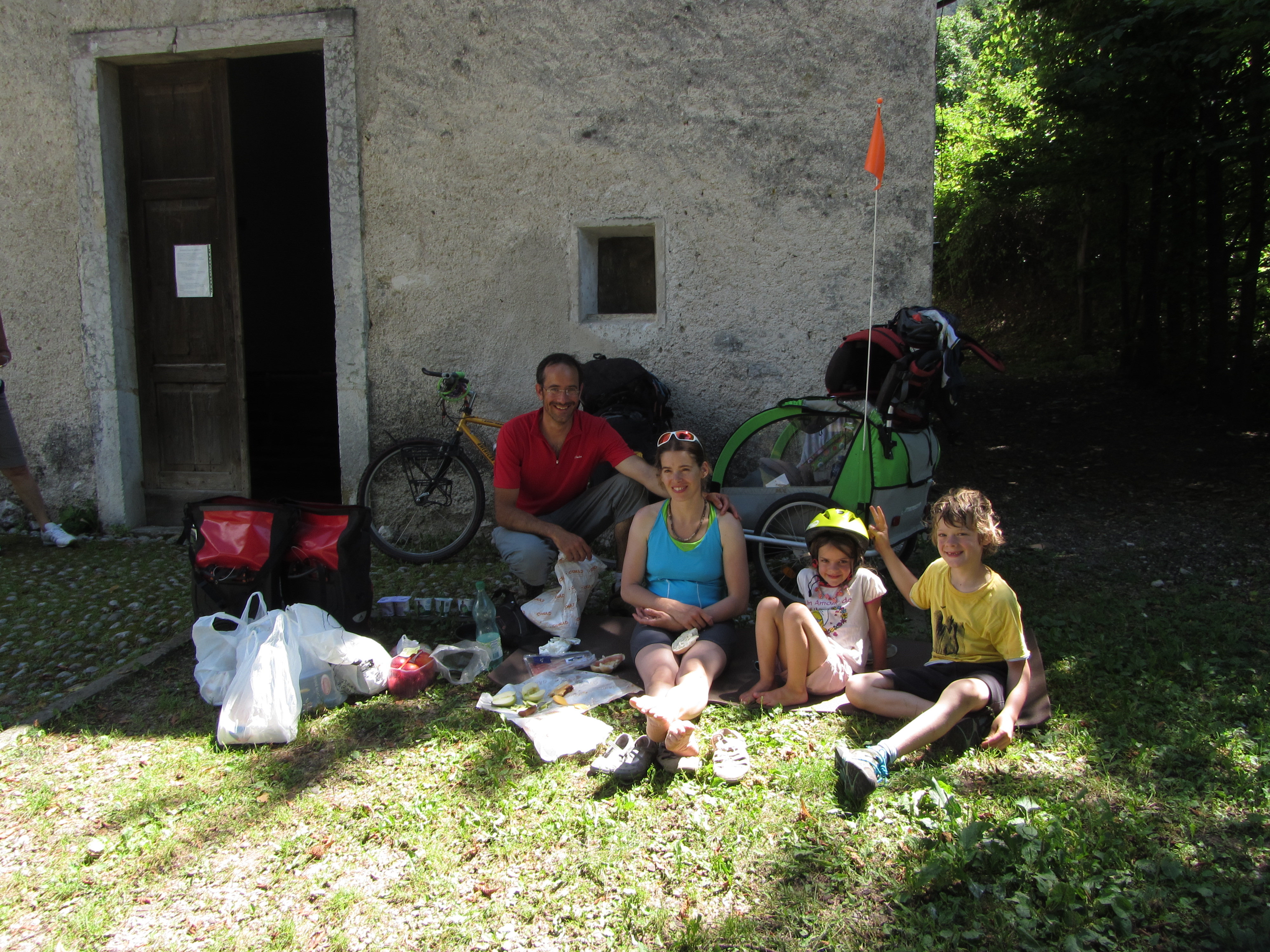 Vendredi 3 aout : nous sommes déjà en sueur ce matin en pliant la tente à 7 h. Difficile de lever tout ce petit monde plus tôt, car nous ne nous couchons pas avant minuit, afin de pédaler le soir « au frais ». Nous commençons à pédaler ce matin à 9h, il fait déjà trop chaud, et nous allons le payer cher dans la petite montée d’Asolo, qui parait interminable pour Gaspard sous ce soleil de plomb. Nous passerons finalement la journée dans le village à la recherche de courants d’air… inexistants !