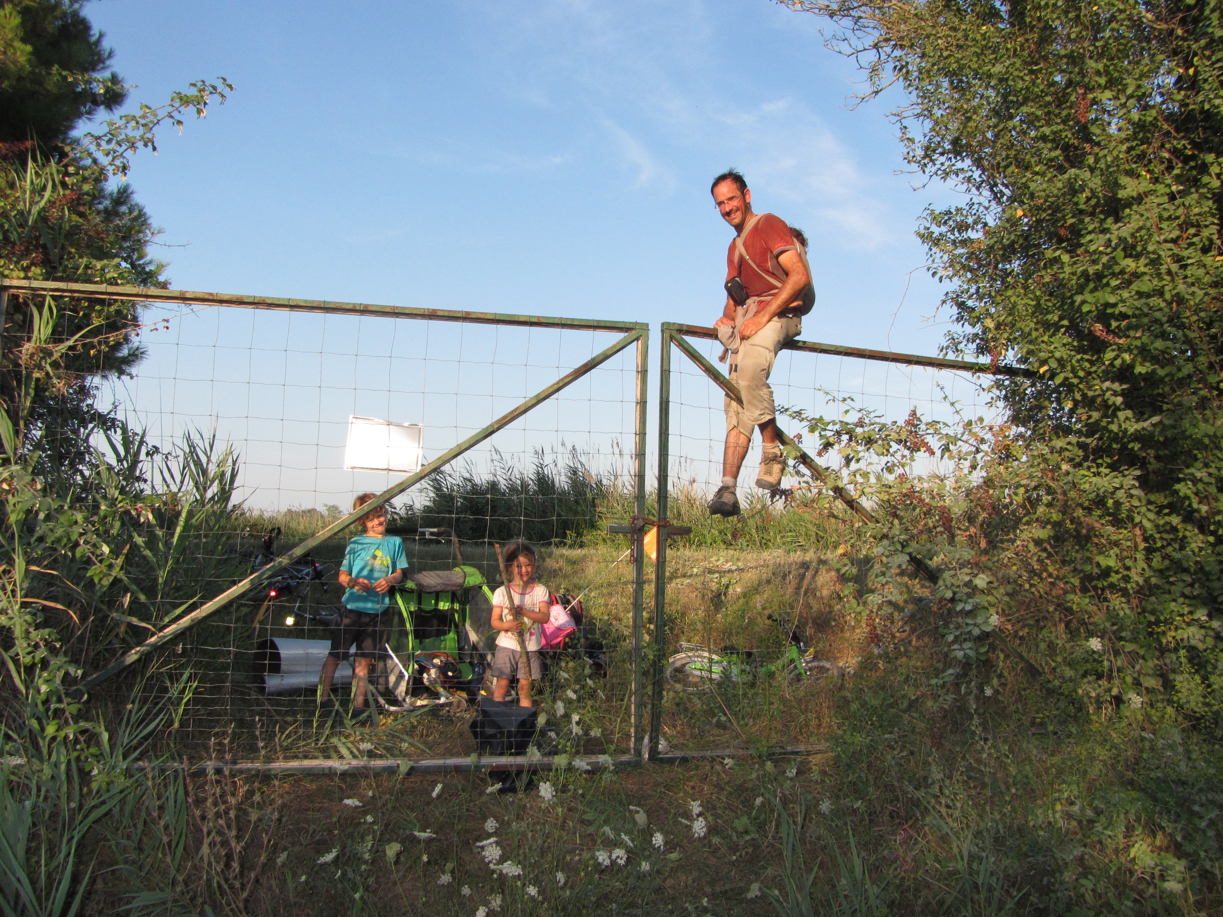 En attendant nous parcourons l’un des endroits les plus sauvages de la lagune, le long de petits canaux riches en oiseaux divers, qu’il s’envole sur notre passage. C’est très paisible. Comme il est vrai qu’on s’ennuie un peu durant ce voyage, le pneu de Seb crève, première crevaison du voyage. Il faut changer la chambre à air. Enfin, au bout de quelques kilomètres, voilà à nouveau un portail, surmonté de pics assérés, qui nous barre la route. Et pas d’interphone cette fois-ci.Nous sommes piégés entre deux portails ! Seb part en reconnaissance et découvre à quelques dizaines de mètres, un second portail, en grillage cette fois-ci, moins haut, bref, nettement moins insurmontable ! Nous décidons de le franchier et pour cela nous démontons entièrement tout notre chargement (sacoches, remorque, etc…). Puis on fait passer les enfants, le Titouan sur le dos, et les 200 kg d’affaire ! Beau travail d’équipe !