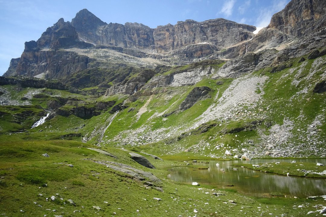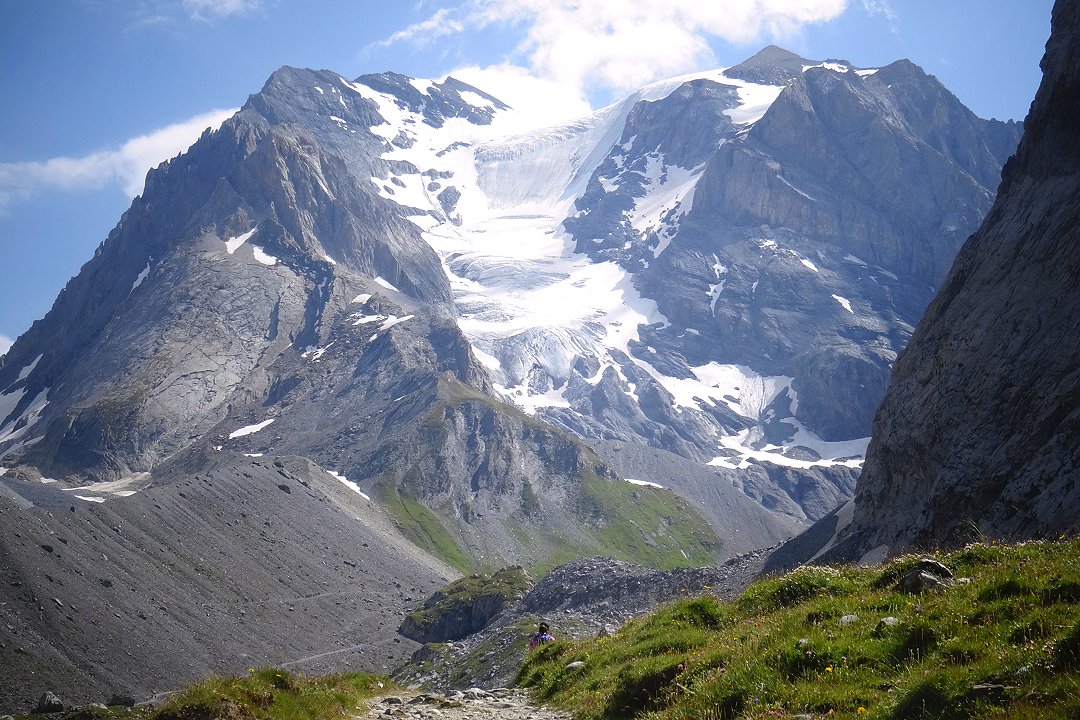 En fin de matinée, dominées par l’Aiguille de la Vanoise (bon souvenir avec SebL et Nico :), il y a qqs années) nous commençons la montée vers le col de la Vanoise. Aux Barmettes, le télésiège déverse un flot ininterrompu de randonneurs qui vont voir la cascade du Vallonet cinq minutes plus haut, ou montent manger au refuge de la Vanoise, à peine situé 500 m plus haut. Difficile de marcher tant il y a de monde sur le sentier ! Mais une fois passé le col de la Vanoise, nous ne rencontrerons plus grand monde jusqu’au refuge de l’Arpont : le contraste est saisissant ! Petit coucou à la Grande Casse, et à nouveau souvenir d’une magnifique journée de ski de rando avec SebV et Nico (toujours !…). Ces deux jours vont être l’occasion de raconter à Adélie tous ces moments exceptionnels passés en alpi ou en ski sur les sommets qui nous entourent.